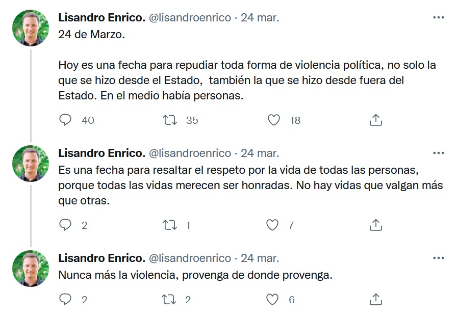 En su red social, el legislador provincial expresó: “Hoy es una fecha para repudiar toda forma de violencia política, no solo la que se hizo desde el Estado, también la que se hizo desde fuera del Estado. En el medio había personas”. En un siguiente tweet, agregó: “Es una fecha para resaltar el respeto por la vida de todas las personas, porque todas las vidas merecen ser honradas. No hay vidas que valgan más que otras”.