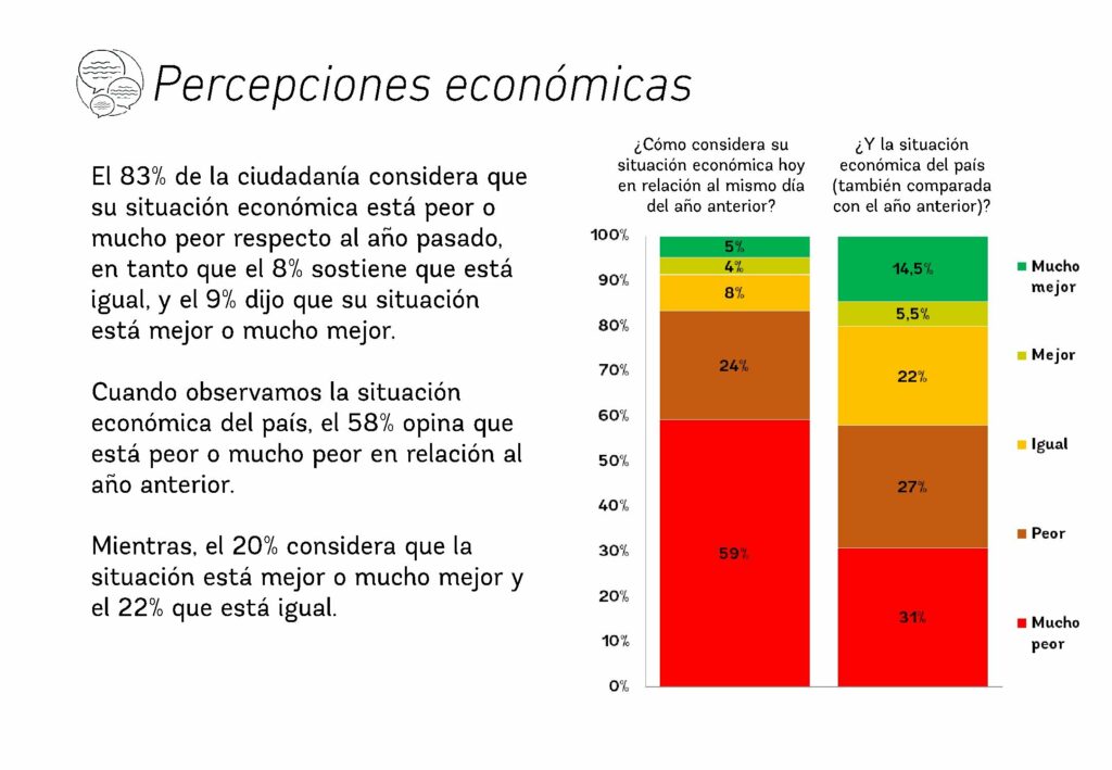 Con respecto a la percepción económica personal, el 83% de la ciudadanía considera que su situación económica está peor o mucho peor respecto que el año pasado. El 8% sostiene que está igual y el 9% dijo que sus situación esta mejor o mucho mejor. Sobre la situación del país, el 58% opina que está peor o mucho mejor que el 2021 mientras que el 20% considera que la situación está mejor o mucho mejor y el 22% que está igual.