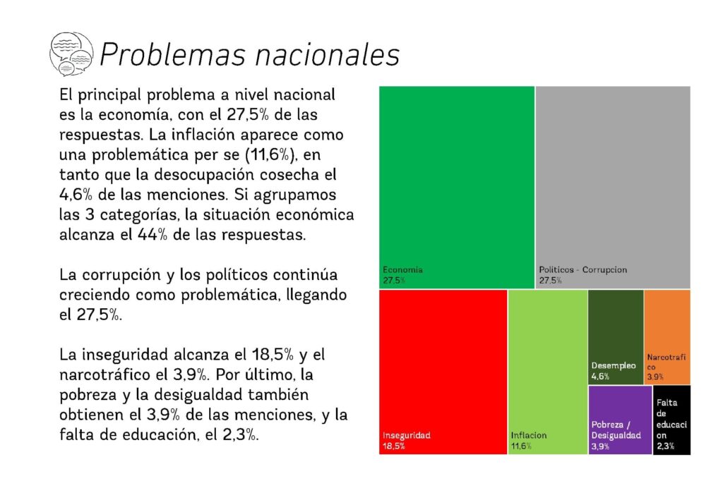 Al ser consultados por los problemas nacionales, el 27,5% opinó que la economía es el principal problema. La inflación aparece como una problemática per se con un 11,6% mientras que la desocupación obtiene el 4,6%. Entre las tres categorías, la situación económica alcanza el 44% de las respuestas.