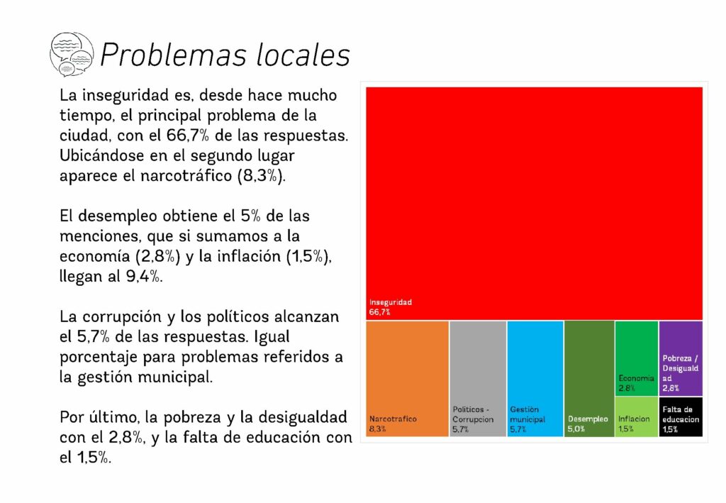 El principal problema que tiene Rosario es la inseguridad con un 66,7% y narcotráfico ocupa el segundo lugar con un 8,3%. Desempleo obtiene un 5%, que al sumarse economía (2,8%) e inflación (1,5%) llega al 9,4% para la situación económica.