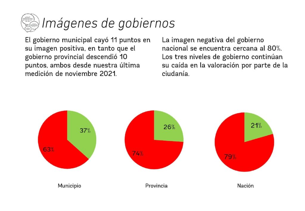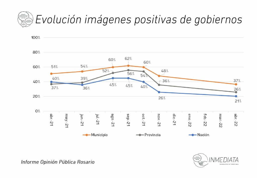 Sobre las imágenes de las gestiones, hubo una fuerte caída en la percepción de los rosarinos sobre el gobierno municipal de 11 puntos con respecto a la última medición de la misma consultora en noviembre de 2021. Por su parte, el gobierno provincial también tuvo una caída de 10 puntos mientras que el gobierno nacional llega al 80% de imagen negativa.