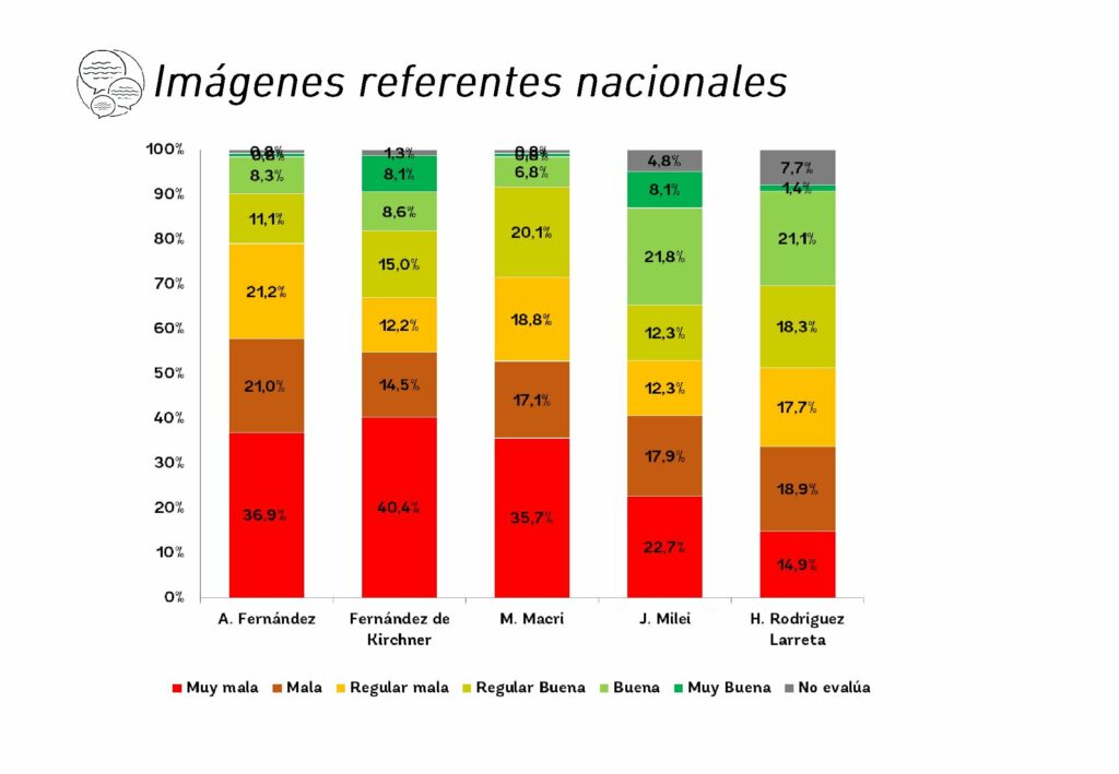 Cinco dirigentes nacionales fueron medidos en esta encuesta y dio como resultado que Javier Milei y Horacio Rodríguez Larreta encabezan el ranking de imagen positiva con un 44% cada uno. Muy atrás quedó la vicepresidenta Cristina Fernández de Kirchner con un 32%, el ex presidente Mauricio Macri con un 28% y al actual mandatario Alberto Fernández cierra con un 20%.