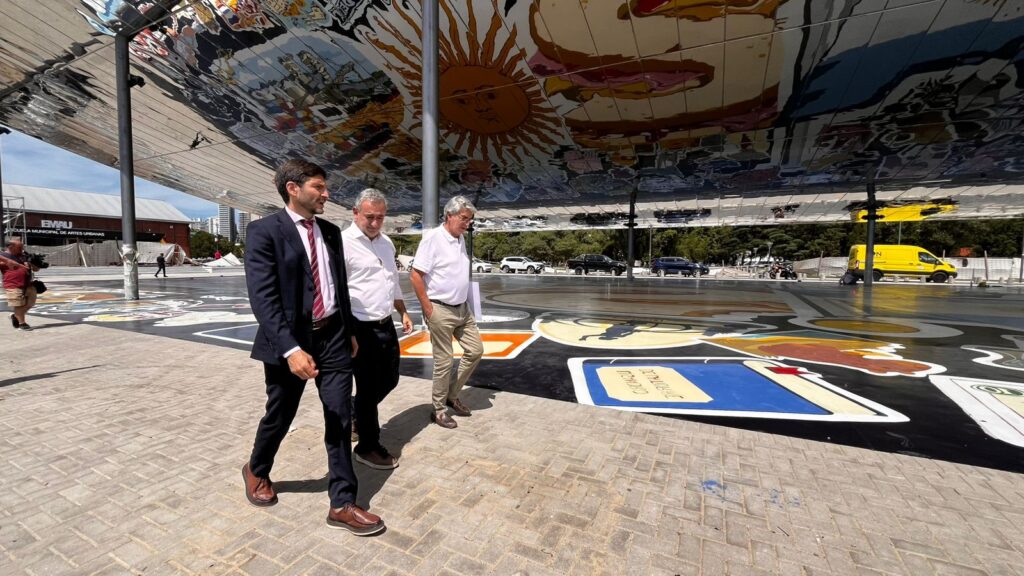 Durante la recorrida, las autoridades destacaron la incorporación de la cubierta reflectante “El Aura del Tricentenario”, un innovador espacio de usos múltiples que se convierte en uno de los principales atractivos del paseo. La intervención urbana se completa con un extenso mural sobre el suelo, ubicado entre los galpones 13 y 15, que refuerza la identidad cultural del sector y revaloriza el paisaje ribereño.