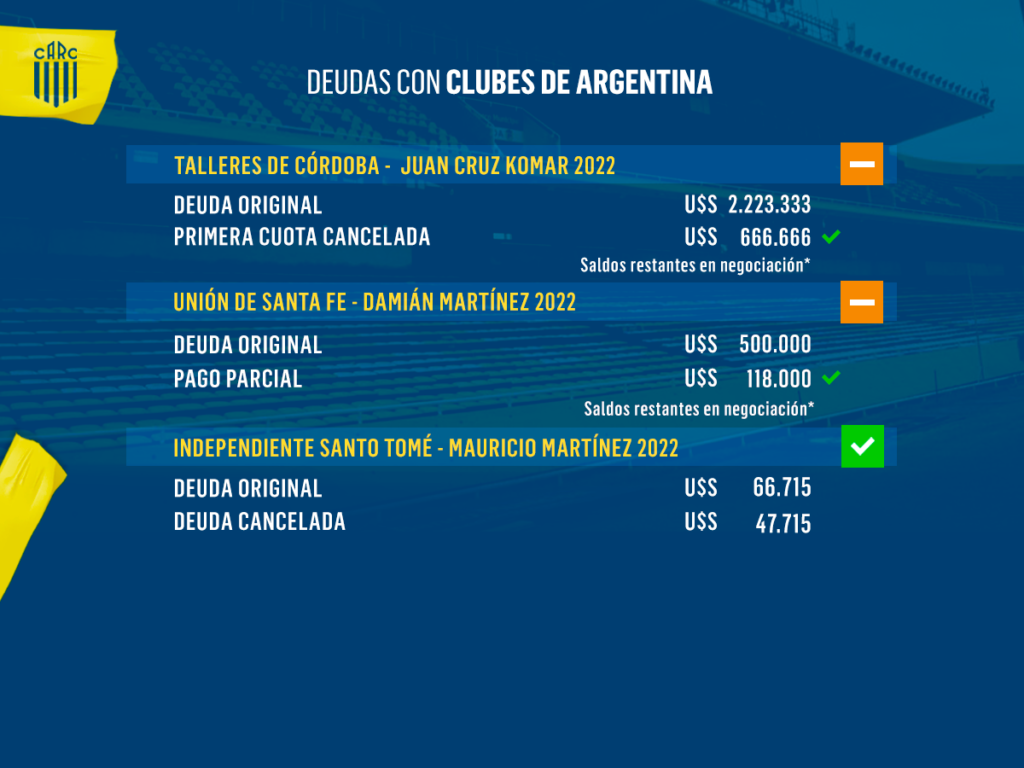 Con respecto a las deudas contraídas por el club Rosario Central antes del 18 de diciembre pasado, la institución lanzo un comunicado oficial donde presenta su “Plan de Desendeudamiento”, realizado con el apoyo de profesionales de cada área y basados en dos premisas fundamentales.