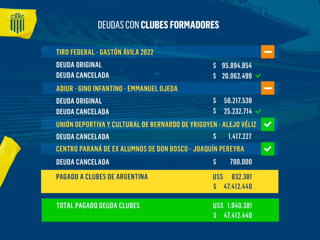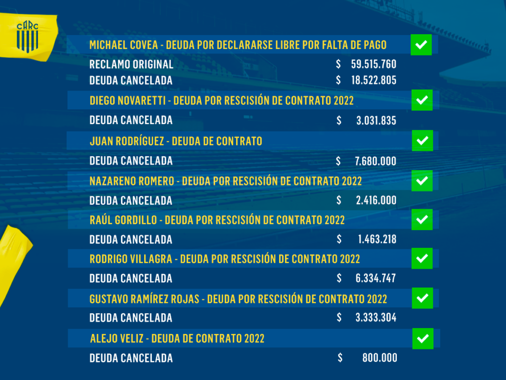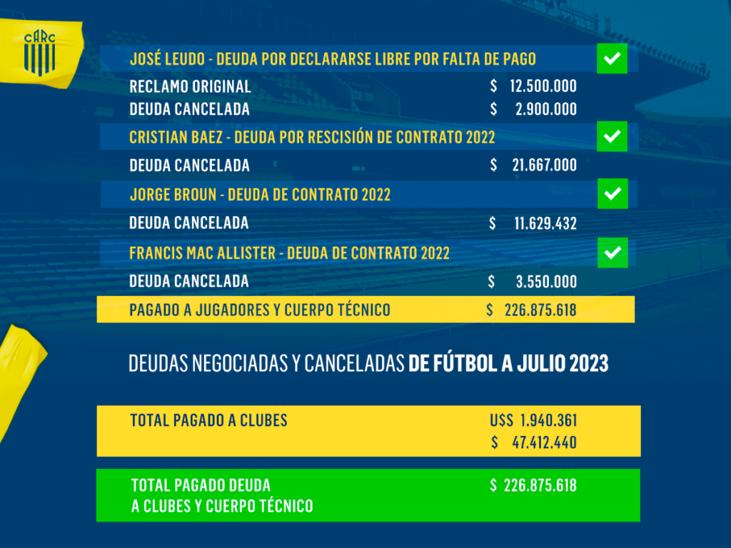 Además desde el club indican el cumplimiento de pago con: cuerpos técnicos, clubes, jugadores, agentes (entre otros) de compromisos (contratos laborales, traspasos y comisiones) que habían sido asumidos por la anterior CD y que no habían sido cumplidos hasta la actualidad.
