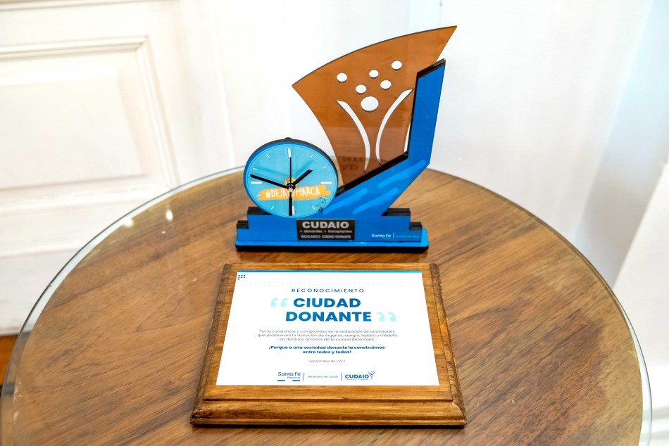 El intendente Pablo Javkin, junto a autoridades municipales y referentes de organizaciones sociales, participó este jueves 28 de septiembre del acto de reconocimiento a Rosario como ciudad donante, distinción formalizada por el Cudaio (Centro Único de Donación, Ablación e Implante de Órganos) por constituir una de las urbes que generan mayor cantidad de donantes del país, por promover sostenidamente la donación de sangre voluntaria como también la donación de órganos, tejidos y médula ósea, y porque desde diversas instituciones sociales, educativas y culturales se acompaña decididamente en instancias de sensibilización, capacitación y formación de la temática.