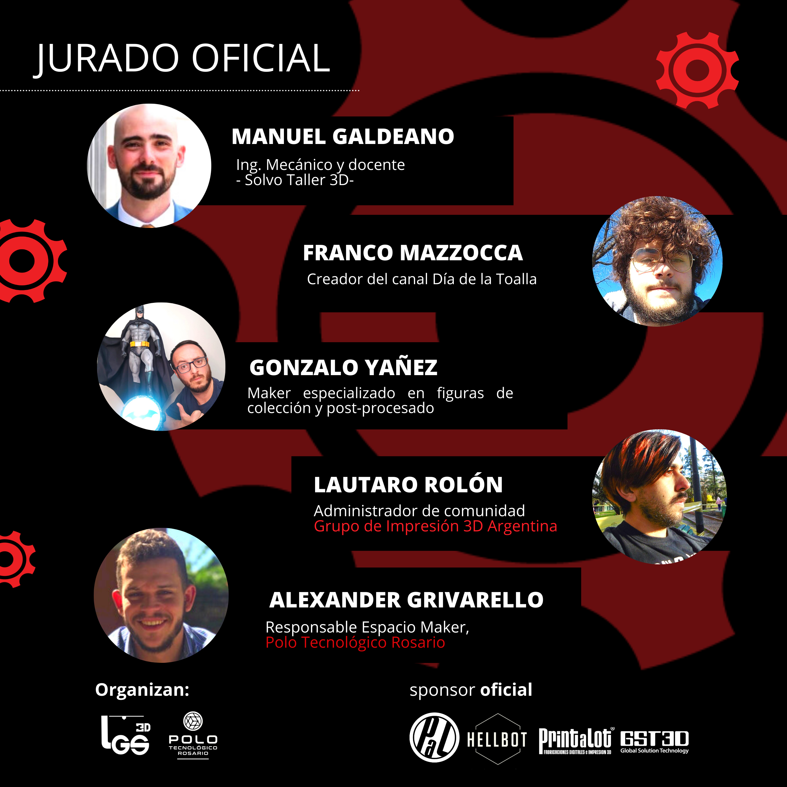 El jurado oficial está compuesto por: Manuel Galdeano, Ingeniero Mecánico y docente, Solvo Taller 3D; Franco Mazzoca, creador del canal Día de la Toalla; Gonzalo Yañez, Maker especializado en figuras de colección y post-procesado; Lautaro Rolón, Administrador de comunidad Grupo de Impresión 3D Argentina; y Alezander Grivarello, responsable de Espacion Maker, Polo Tecnológico Rosario.