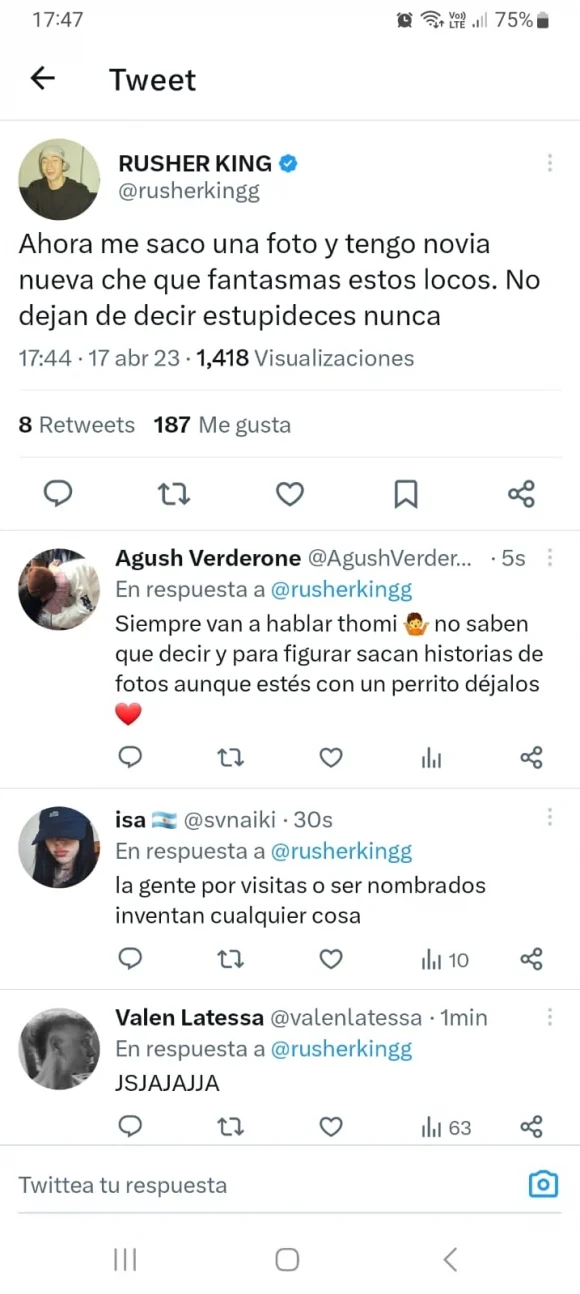 Ante la viralización de estas fotos, Rusherking no tardó en salir a expresar su enojo en las redes sociales, escribiendo en su cuenta de Twitter: “Ahora me saco una foto y tengo novia nueva, che. ¡Que fantasmas estos locos! No dejan de decir estupideces nunca”.