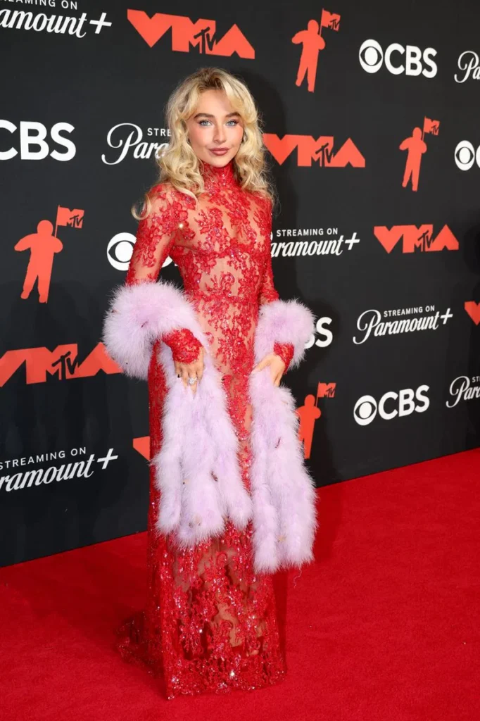 Sabrina Carpenter compartió su entusiasmo por la moda y antiguas estrellas del pop en la gala de los MTV Video Music Awards de este 2025 que tomaron lugar en el UBS Arena de Elmont, Nueva York. Sabrina decidió inaugurar su noche llegando al establecimiento con un elegante vestido de encaje rojo de Valentino que lo combinó con una boa de plumas lila, y a lo largo de la noche tuvo tres cambios de vestimenta de diseño vintage de Bob Mackie, los cuales dos de estos looks hacían referencia a dos grandes leyendas del pop.