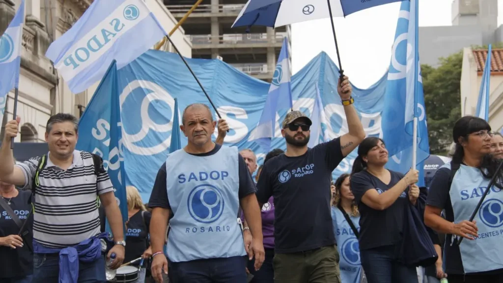 El Sindicato Argentino de Docentes Privados (Sadop) realizó este lunes una protesta en la ciudad de Rosario, en el marco del rechazo a la propuesta salarial presentada por el gobierno de Santa Fe en la actual negociación paritaria. Desde el gremio expresaron un rechazo contundente al ofrecimiento y anunciaron medidas de fuerza.