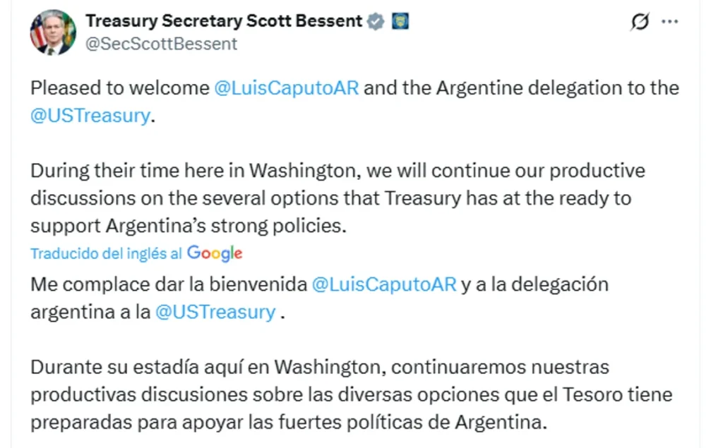 El secretario del Tesoro norteamericano, una figura clave en el andamiaje económico de Donald Trump, reafirmó la voluntad de avanzar en un acuerdo: “Durante su tiempo aquí en Washington, continuaremos nuestras productivas discusiones sobre las varias opciones que el Tesoro tiene listas para apoyar las fuertes políticas de Argentina“.