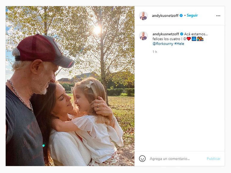 Todo es felicidad en la vida de Andy Kusnetzoff, que este miércoles anunció que será padre nuevamente junto a su mujer, Florencia “Kourny” Suárez. “Acá estamos… ¡felices los cuatro! @florkourny #Hele”, redactó el periodista.