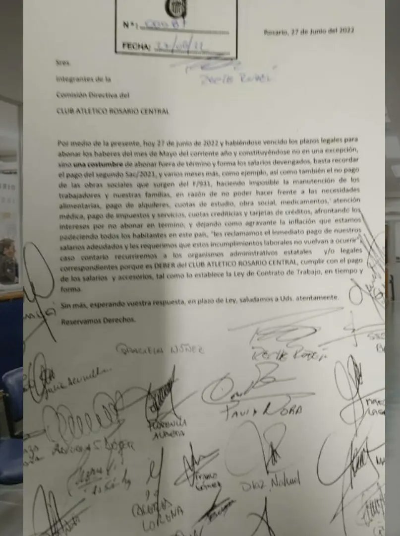 Los empleados y empleadas de Rosario Central elevaron un reclamo este martes por una deuda por parte del club en cuanto al pago de los salarios del mes de mayo. Además, destacan que tampoco les fue abonado el aguinaldo de diciembre del año pasado y los aportes sociales.