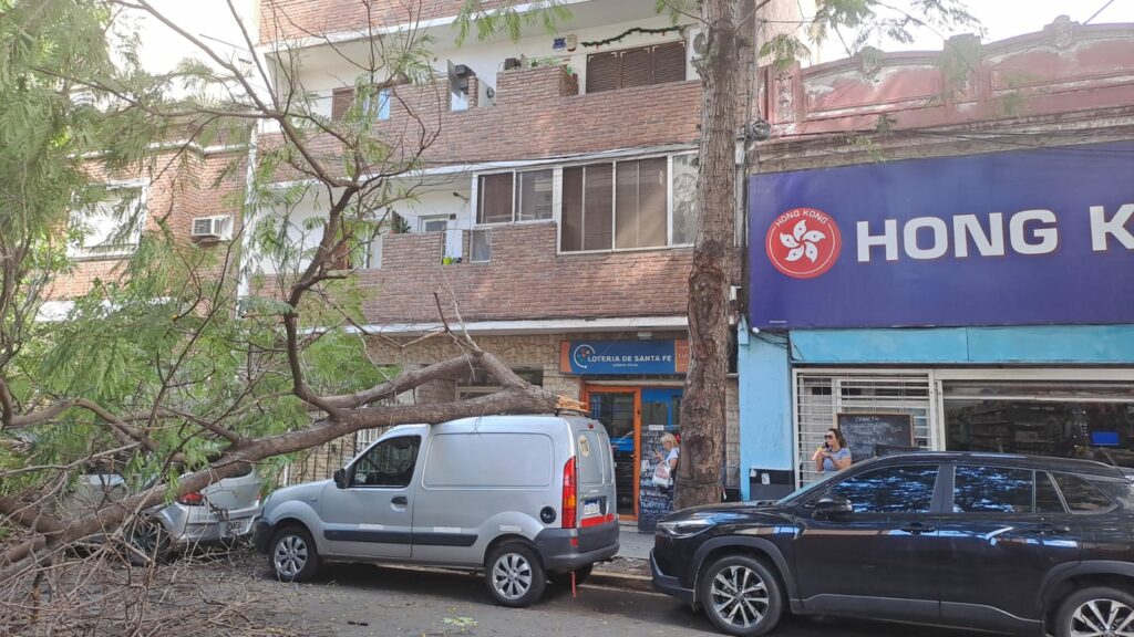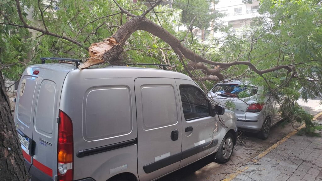 Una rama de gran porte cedió y cayó sobre varios autos que estaban estacionados en pleno centro de la ciudad. Los vehículos damnificados fueron al menos dos, que quedaron debajo del pedazo de árbol que se desprendió del mismo.