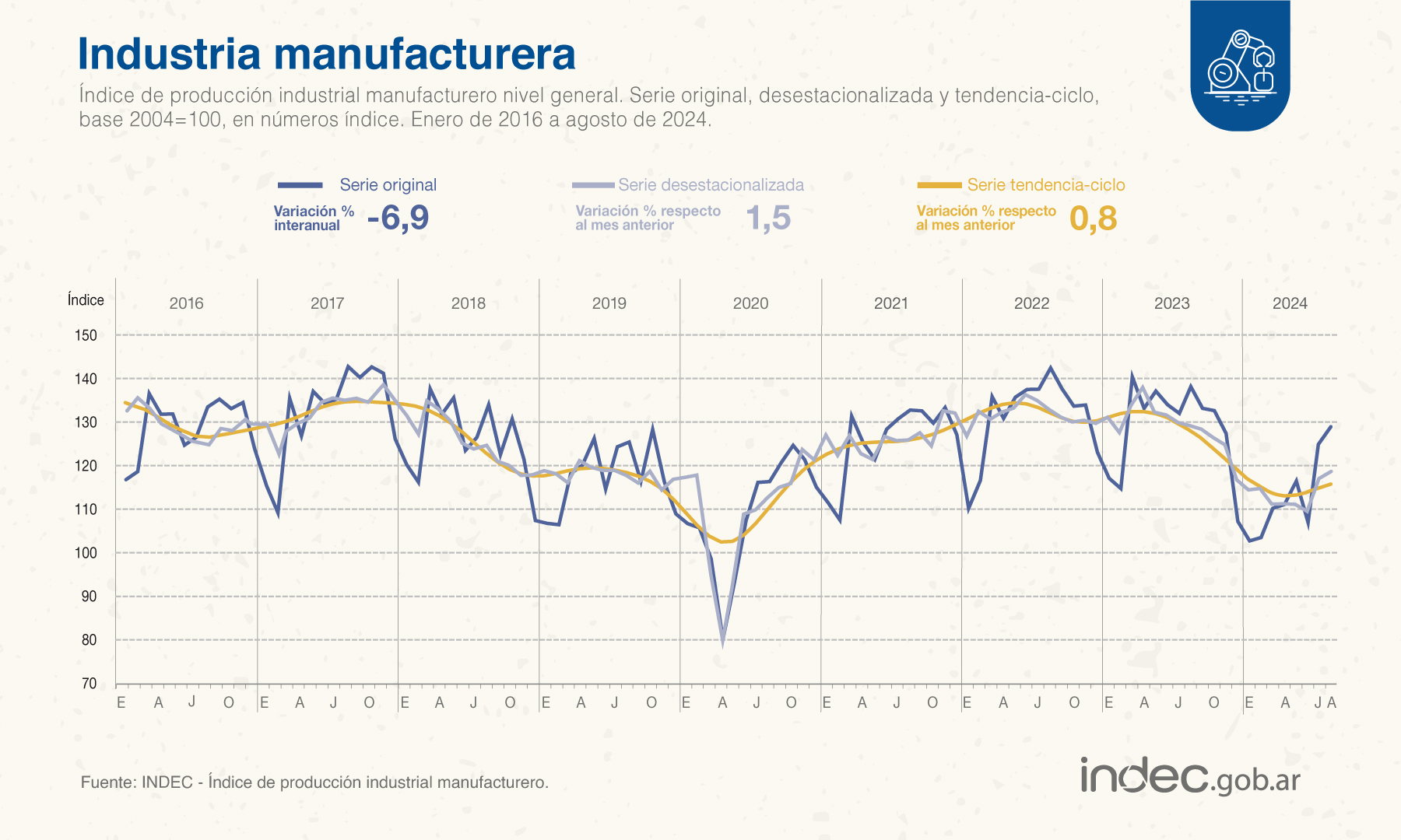 En lo que se refiere a industria, cayó 6,9% interanual en agosto de 2024 pero mostró una mejoría del 1,5% respecto del mes previo.