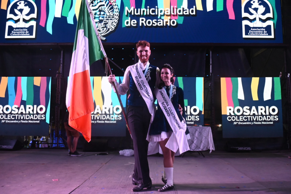 Para este año se presentaron 19 parejas de embajadores. En la noche del domingo 5 de noviembre, quedaron electos como ‘embajadores culturales de Rosario Colectividades 2023’ ambos representantes de la colectividad irlandesa. Se trata de Alejandro Mahon y Samanta Rossi Coghlan quienes bailaron y llevaron todo el color irlandés al escenario en una noche que contó con un espectáculo producido por un grupo de profesoras y profesores de distintas colectividades de la Asociación de Colectividades Extranjeras de Rosario.