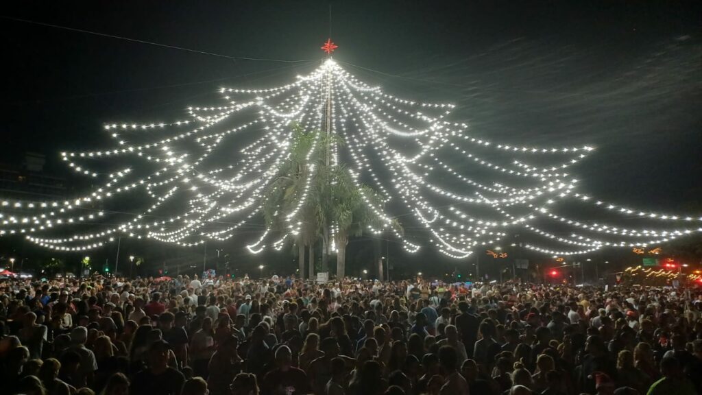 El tradicional arbolito de la rotonda de avenida Pellegrini y bulevar Oroño está equipado con 3.000 luces led que garantizan mayor potencia lumínica, menor consumo y que acompañan la política pública municipal de recambio a luminarias con dicha tecnología en avenidas y barrios de toda la ciudad.