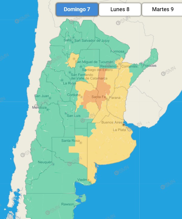 De acuerdo a lo expresado por el SMN, el área será afectada por tormentas, algunas localmente fuertes. Las mismas estarán acompañadas por ráfagas intensas, fuerte actividad eléctrica, ocasional caída de granizo y abundante caída de agua en cortos períodos. Se estiman valores de precipitación acumulada entre 20 y 50 mm, pudiendo ser superados en forma puntual.