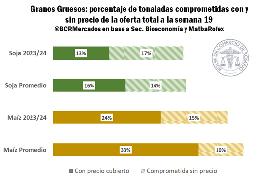 Dada las condiciones comerciales particulares de esta campaña, que han llevado a mantener una proporción importante de la oferta total esperada sin un precio fijo (tanto en soja como maíz), es probable que los negocios por granos corran al ritmo de la cosecha. Por lo que el importante avance logrado durante la primera mitad de mayo y las auspiciantes condiciones climáticas para la próxima semana podrían impactar favorablemente sobre la dinámica comercial.