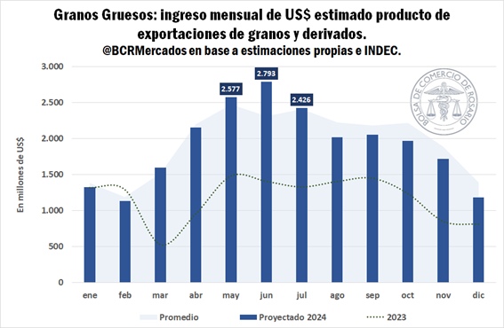 Teniendo en cuenta las exportaciones proyectadas tanto de maíz como soja y derivados para este año, los granos gruesos aportarían neto de importaciones, US$ 23 mil millones (en base a proyecciones propias y cotizaciones actuales) de las cuales US$ 8 mil millones se concretarían en estos tres meses.