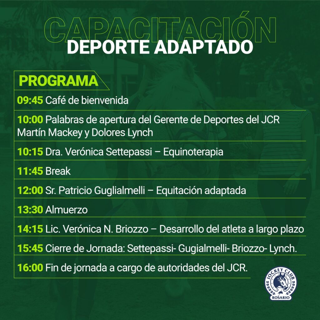 Contribuyendo a la rehabilitación y desarrollo de personas con algún tipo de problemática, este martes 12 el Jockey Club de Rosario ofrecerá una capacitación de “Equitación Adaptada y Equinoterapia”. A partir de las 9.45 h en La Dulce, Country JCR, se podrá disfrutar de una jornada dedicada al deporte adaptado.