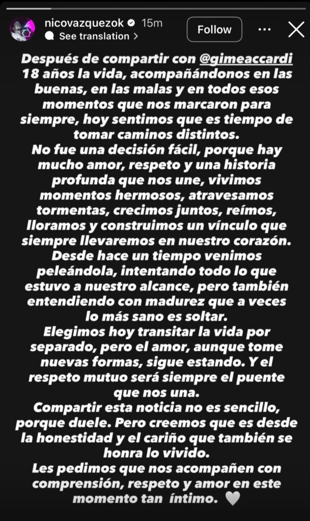 Este martes Nicolás Vázquez y Gimena Accardi anunciaron su separación. La pareja lo hizo a través de historias de Instagram. El actor escribió: “Después de compartir 18 años de la vida con Gimena (acompañándonos en las buenas y en las malas), hoy sentimos que es el momento de tomar caminos distintos”, introdujo.