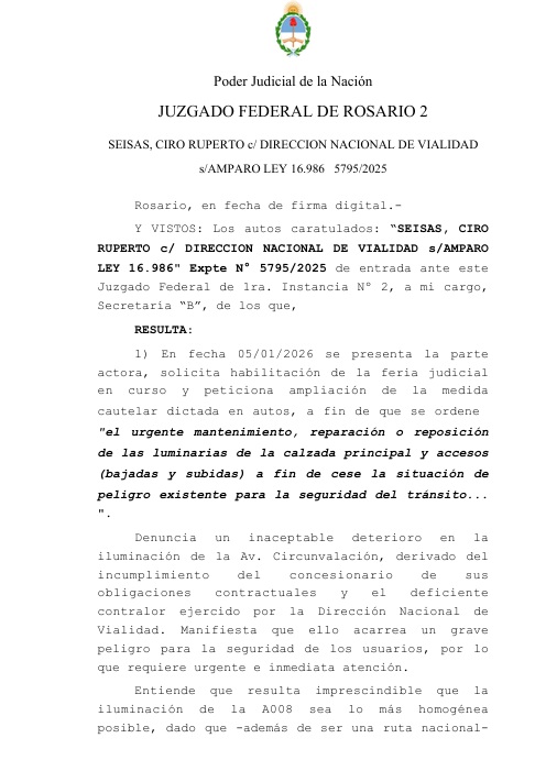 En las próximas horas, terminará el plazo que le puso la jueza federal Natalia Martínez a Nación para el mantenimiento de Avenida Circunvalación en Rosario. El escrito, de 16 páginas, le daba diez días a la administración de Javier Milei para reponer luminarias y cortar el pasto en la traza vial. En ese marco, el senador provincial Ciro Seisas le dijo a RedBoing: “Hace casi un año que venimos peleando para Vialidad Nacional haga lo básico”.