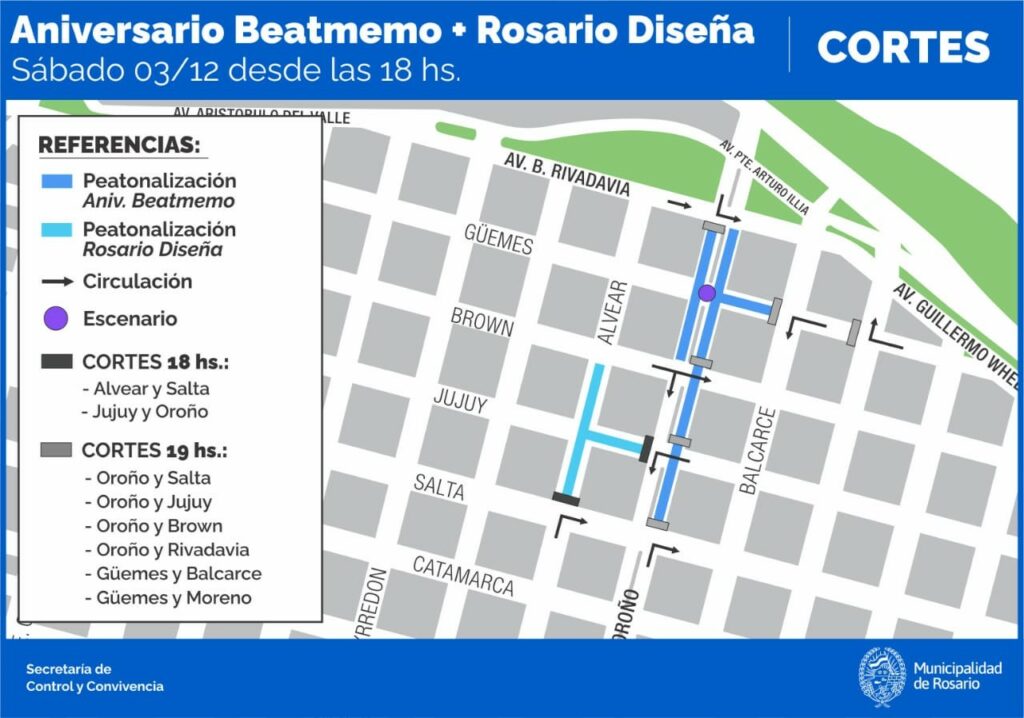 El evento tendrá lugar desde las 19:30hs a la 00 hs, en Oroño y Jujuy, con peatonalización hasta Santiago, más otro corte en Salta y Alvear, con peatonalización hasta calle Brown. Sin embargo, el corte de calles se realizará desde las 18 a la 01 am por lo que durante esa franja horaria los autos no podrán circular por las calles mencionadas.