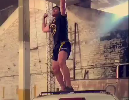 En las imágenes compartidas en twitter se puede ver al joven trepando a los vehículos y haciendo gestos para mostrar sus músculos.