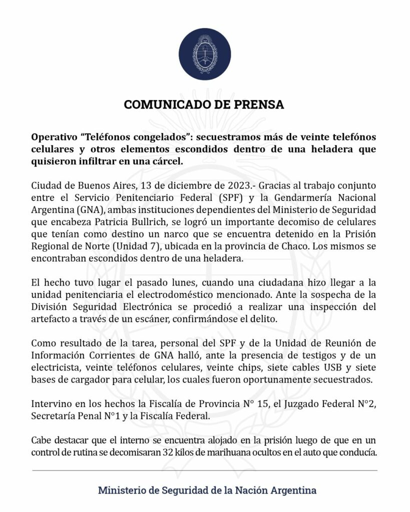 El ministerio de Seguridad de la Nación, bajo el mando de Patricia Bullrich, compartió en la cuenta de X (Ex Twitter) que secuestraron 20 celulares que estaban a punto de ingresar a a la Unidad 7 Prisión Regional Norte ubicada en Resistencia, Chaco, dentro de una heladera.