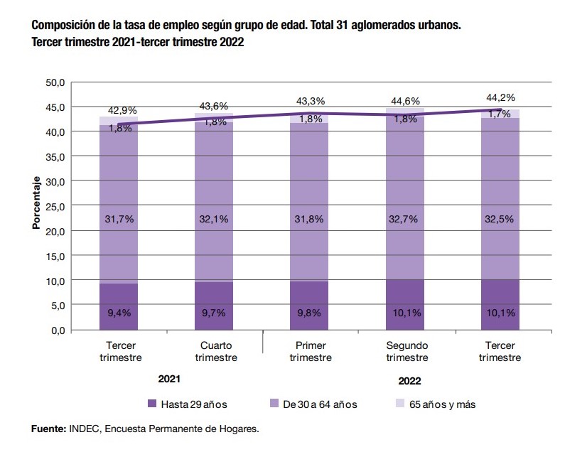 Si se comparan las estadísticas con el mismo período del 2021, las mismas exhiben una baja de 1,1 puntos porcentuales. De esta manera, por su parte la tasa de empleo creció 1,3% en relación al año pasado y llegó a 44,2%.