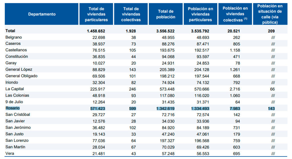 Por su parte, Rosario cuenta con un total de 571.423 viviendas particulares y 599 viviendas colectivas.