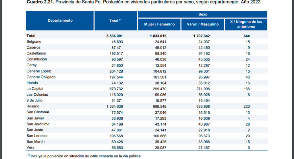 La información que se compartió sobre la población total es por sexo, según provincia y departamento o partido o comuna. También se conoció la cantidad de población en viviendas particulares y colectivas y en situación de calle (por provincia y departamento, partido o comuna) y el total de viviendas particulares y colectivas por provincia y departamento, partido o comuna.