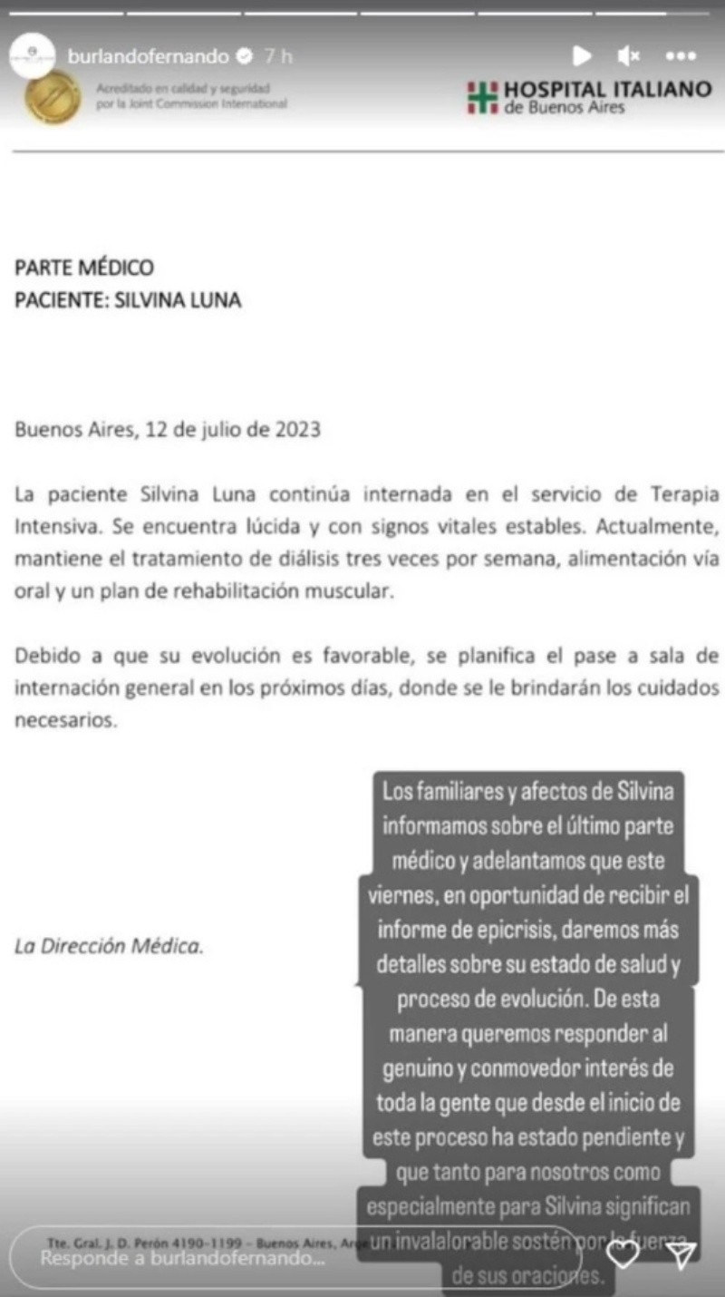 “La paciente Silvina Luna continúa internada en el servicio de Terapia Intensiva. Se encuentra lúcida y con signos vitales estables. Actualmente mantiene el tratamiento de diálisis tres veces por semana, alimentación vía oral y un plan de rehabilitación muscular. Debido a que su evolución es favorable, se planifica el pase a la sala de internación general en los próximos días, donde se le brindarán los cuidados necesarios”, expresaron desde el nosocomio.