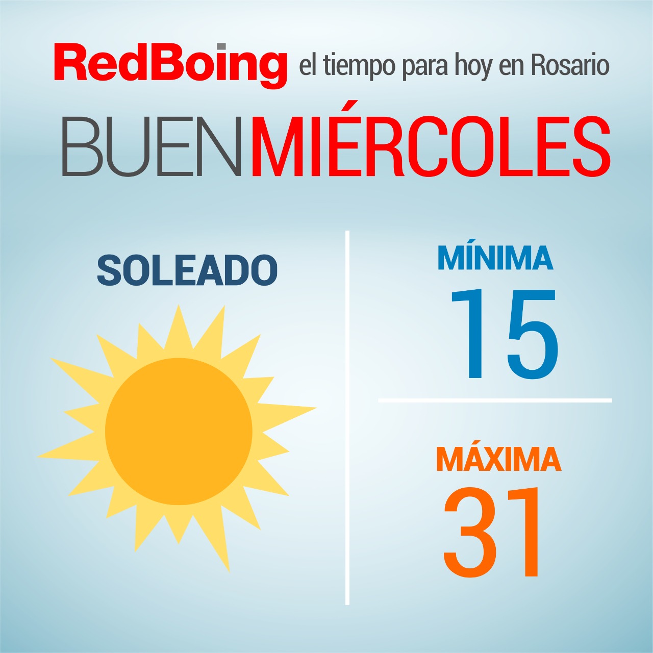 El Servicio Meteorológico Nacional informó que este miércoles en la ciudad de Rosario será un día soleado, con mínima de 15º y máxima de 31º. Por la mañana se espera una media de 21º y hacia el mediodía unos 28º.