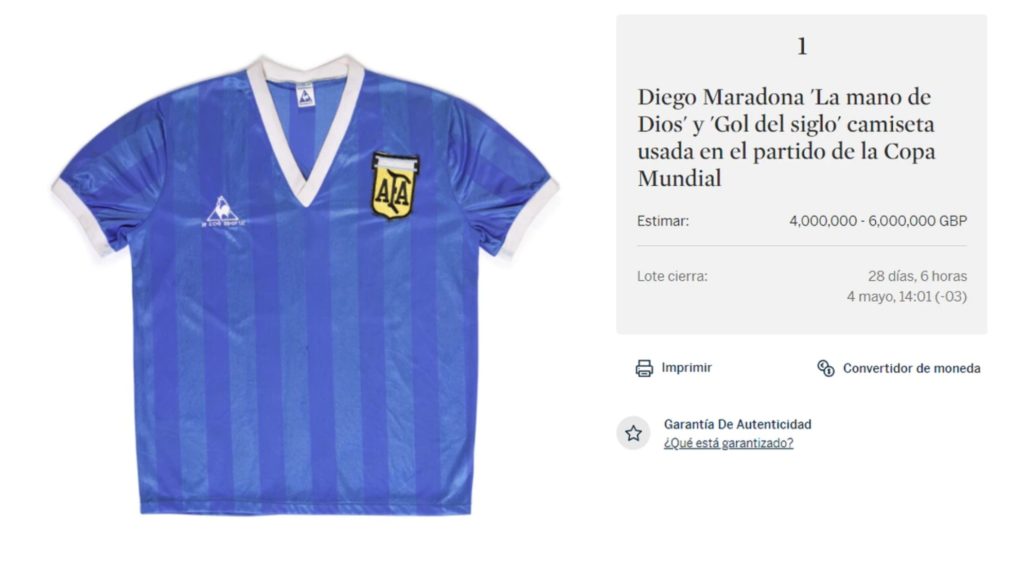 La agencia Sotheby’s verificó la originalidad de la camiseta y su página web lo hizo público: “Parte del desafío al evaluar la camiseta fue identificar la camiseta con los dos goles históricos. Como parte de este esfuerzo, Sotheby’s trabajó con Resolution Photomatching para hacer coincidir la camiseta con ambos objetivos, examinando detalles únicos en varios elementos del artículo, incluido el parche, las rayas y la numeración. La resolución Photomatching determinó que Maradona cambió de camiseta durante el partido, pero que usó esta camiseta para los dos goles históricos en la segunda mitad del partido”.
