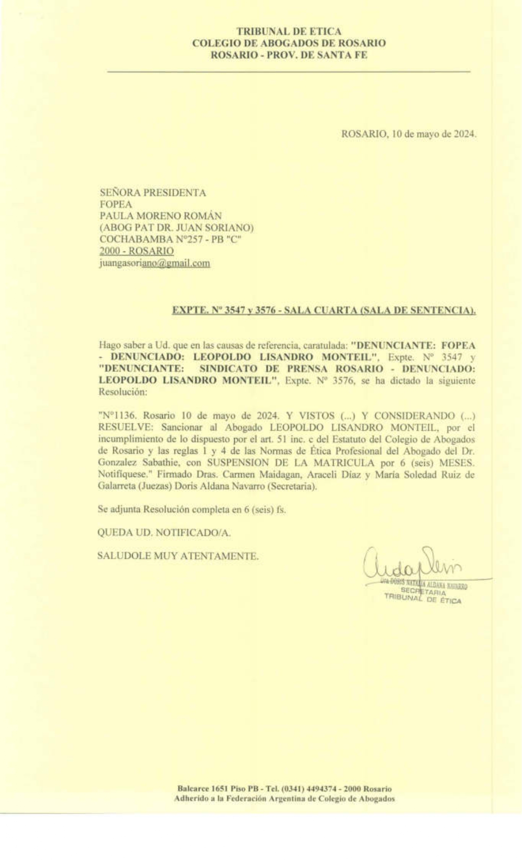 Por otra parte, en las últimas horas se conoció una resolución del Colegio de Abogados de Rosario en donde sancionaron a Montil por el incumplimiento de lo dispuesto por el artículo 51, inciso C del estatuto del Colegio de Abogados de Rosario. Como así también, las reglas 1 y 4 de las normas de ética profesional de la abogacía. Por tales motivos, se decidió aplicarle una suspensión de la matricula profesional al abogado Leopoldo Montiel.