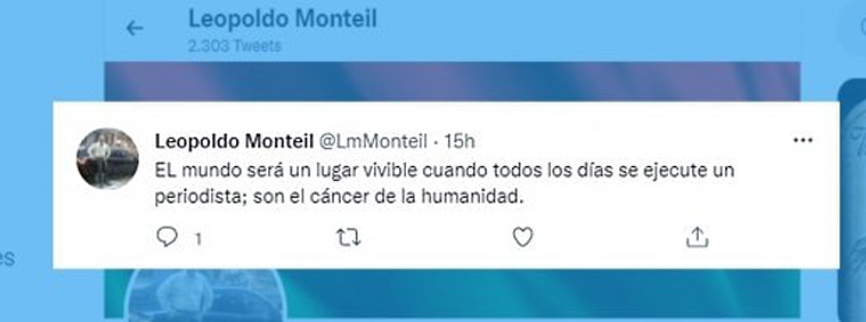 Cabe recordar que el 25 de septiembre del 2022 desde la cuenta de la red social X (anteriormente Twitter) @LmMonteil (Leopoldo Monteil) se publicó: “El mundo será un lugar vivible cuando todos los días se ejecute un periodista; son el cáncer de la humanidad.”