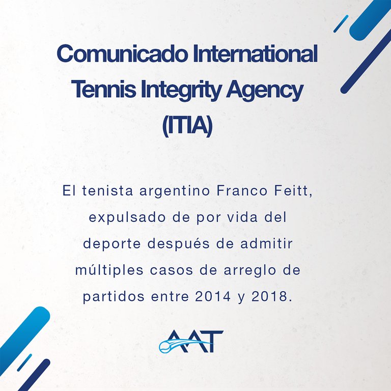 “La Agencia Internacional de Integridad del Tenis (ITIA) confirmó este martes que el tenista argentino de 28 años Franco Feitt fue expulsado de por vida del deporte después de admitir múltiples casos de arreglo de partidos entre 2014 y 2018″, informó la Asociación Argentina de Tenis en su web oficial.