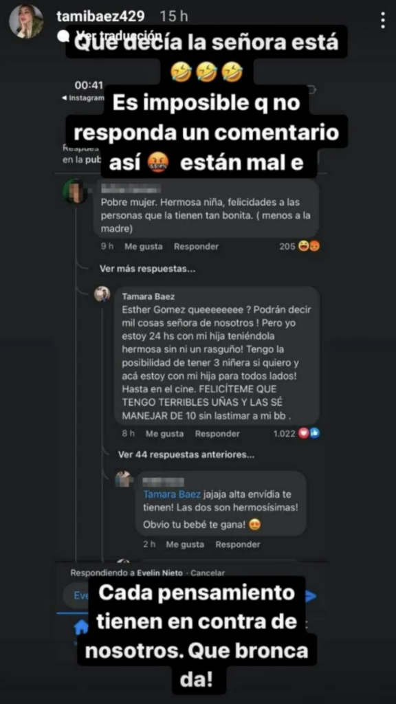 “Qué decía la señora esta… Es imposible que no responda a un comentario así, están mal. Cada pensamiento que tienen en contra de nosotros… Qué bronca me da”, cerró a través de sus stories de Instagram, indignada.
