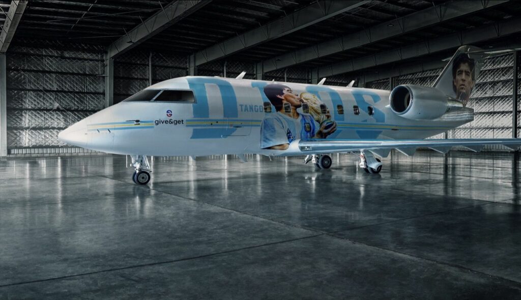 En el acto de presentación estuvieron presentes Dalma y Gianinna Maradona, ex jugadores del combinado nacional que disputaron junto a Diego el Mundial de México 1986 e integrantes de la Iglesia Maradoniana. El avión cuenta con diez lugares y lleva en los costados dos imágenes representativas de Pelusa: de un lado la de él besando la copa y del otro una con “la mano de Dios”.