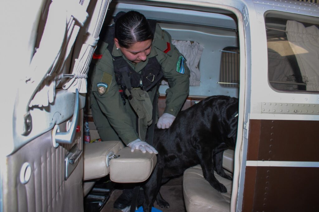 Ese día, a fines del mes pasado y en Oliveros, se encontró dinero en pesos y dólares estadounidense, además de varios teléfonos celulares, algunos de los cuales estaban escondidos en el hangar. Y se decidió inspeccionar la avioneta con un perro antinarcóticos que tuvo signos de excitación y mordió el mando de la aeronave, que para los peritos de la GNA es signo de olor residual de estupefacientes. Lo mismo hizo el perro con una salida de aire, el marco de la puerta del acompañante, un bolso con la leyenda “David Clark” y unos guantes de tela que habían quedado ariba del tablero.