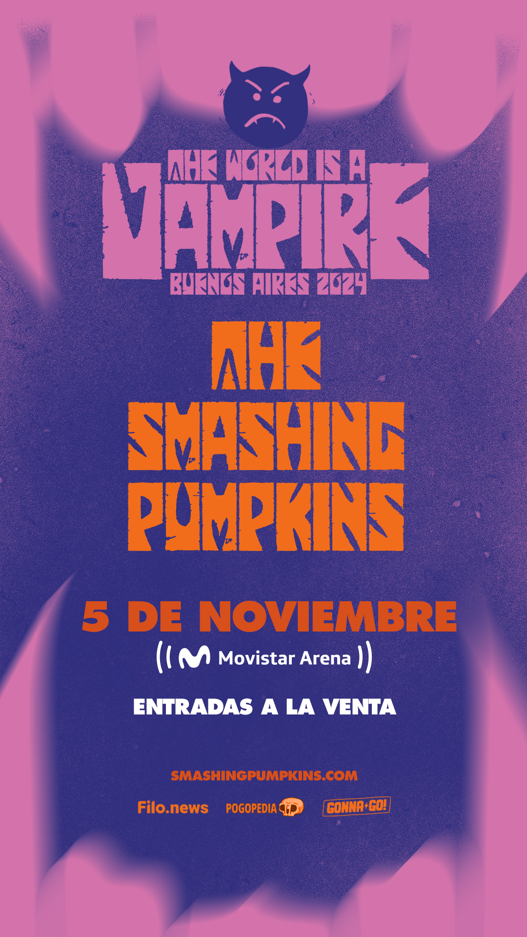 The Smashing Pumpkins anunció su regreso como parte de una gira mundial que tuvo un comienzo memorable en Birmingham, Inglaterra y que ya despierta la locura y expectativa de los fans a medida que se van sumando fechas. El paso por Argentina será el 5 de noviembre en el Movistar Arena de Buenos Aires. Para este esperado tour internacional la agrupación anunció que se presentará con su emblemática formación original.