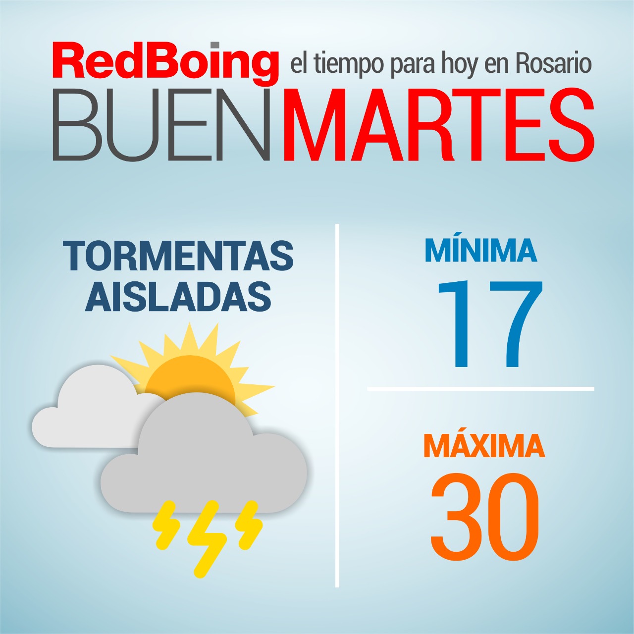 El Servicio Meteorológico Nacional informó que este lunes en la ciudad de Rosario será un día mayormente nublado, con mínima de 17º y máxima de 30º y posibilidad de tormentas aisladas. Por la mañana se espera una media de 22º y hacia el mediodía unos 27º.