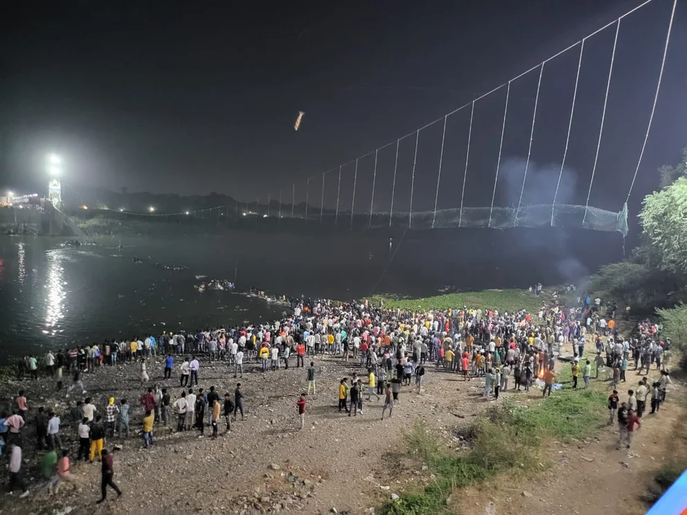 Tragedia en la India. Al menos 91 personas murieron y un centenar más están desaparecidas tras derrumbarse un puente colgante sobre un río en el estado de Gujarat, en el oeste del país asiático.