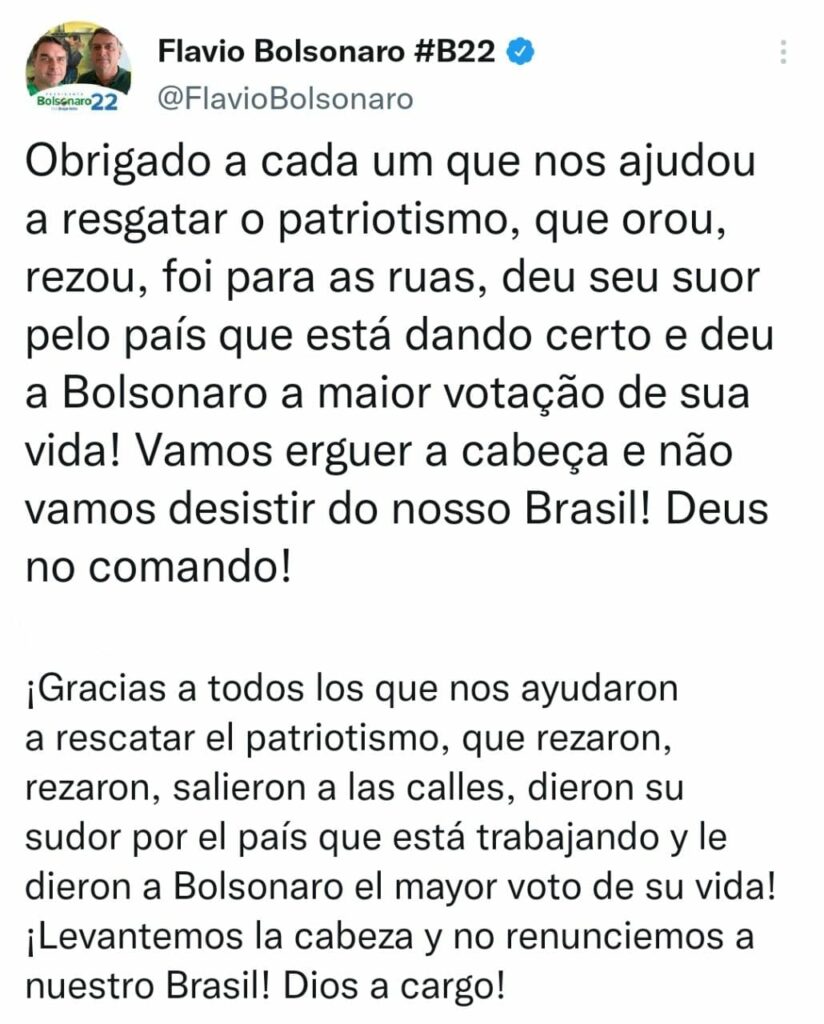 Luego del balotaje y el triunfo de Lula, Jair Bolsonaro no se manifestó sobre el resultado electoral. En esta oportunidad, el senador Flavio Bolsonaro -hijo del actual presidente de Brasil-, se manifestó en Twitter pero sin reconocer el triunfo de Luiz Inácio Lula da Silva.