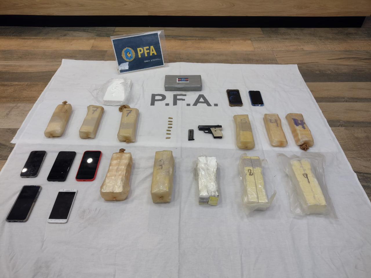 Según fuentes policiales, para poder secuestrar la droga y detener a las personas, se siguieron dos vehículos en los cuales transportaban 10,7 kilos de clorhidrato de cocaína de máxima pureza distribuidos en siete panes y un arma de fuego.