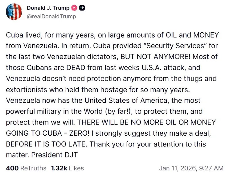 El mandatario estadounidense fue aún más lejos al referirse al operativo militar de la semana pasada. “La mayoría de esos cubanos han muerto tras el ataque estadounidense, y Venezuela ya no necesita protección de los matones y extorsionadores que la mantuvieron secuestrada durante tantos años”, aseguró en su mensaje.
