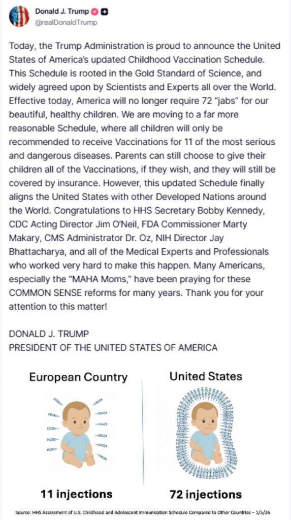 “Hoy, la Administración Trump se enorgullece de anunciar el Calendario de Vacunación Infantil actualizado de los Estados Unidos de América”, expresó el exmandatario en un mensaje difundido públicamente. Según detalló, “Estados Unidos ya no exigirá 72 dosis para nuestros hermosos y saludables niños”.
