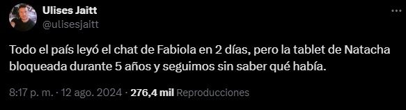 “Todo el país leyó el chat de Fabiola en 2 días, pero la tablet de Natacha bloqueada durante 5 años y seguimos sin saber qué había”, expresó con mucho enojo a través de X.